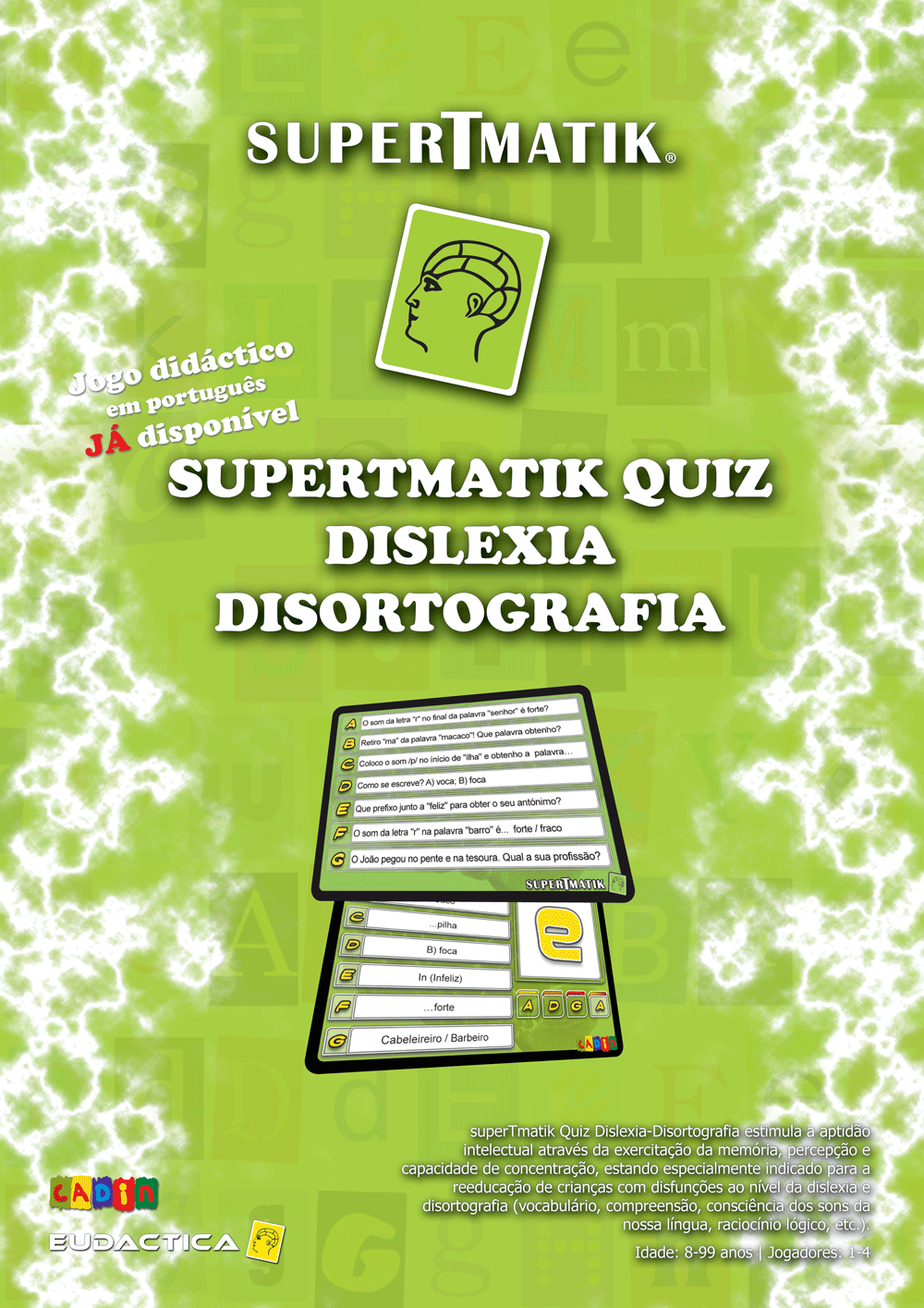 O SuperTmatik Quiz Dislexia e Disortografia estimula a aptidão intelectual através da exercitação da memória, percepção e capacidade de concentração, estando especialmente indicado para a reeducação de crianças com dislexia e disortografia.